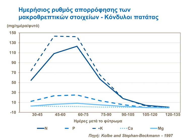 Τόσο το κάλιο όσο και το άζωτο χρειάζονται από τα φυτά σε όλη τη διάρκεια της βλαστικής τους ανάπτυξης, του σχηματισμού αλλά και της διόγκωσης των κονδύλων.